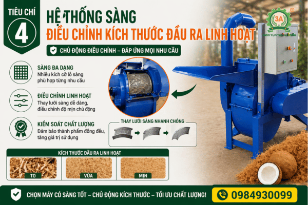 Trong quá trình lựa chọn máy băm xơ dừa công suất lớn, hệ thống sàng là bộ phận quan trọng giúp kiểm soát chất lượng thành phẩm. Một máy được trang bị sàng phù hợp sẽ giúp bạn chủ động điều chỉnh độ mịn của xơ dừa theo nhu cầu sử dụng.