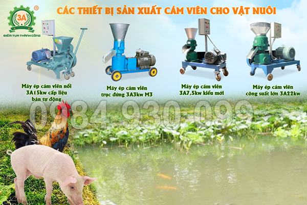 Bên cạnh các dòng máy ép cám viên nổi cho cá chuyên sản xuất thức ăn cho nuôi ao thâm canh, Hãng 3A còn cung cấp nhiều loại máy ép cám viên cho gà, lợn, chim và mô hình chăn nuôi tổng hợp. Các sản phẩm này cho phép bà con tự phối trộn nguyên liệu sẵn có thành viên cám giàu dinh dưỡng, phù hợp từng đối tượng vật nuôi, giúp giảm 20–30% chi phí thức ăn, nâng cao năng suất và chất lượng đàn nuôi, đồng thời tối ưu hiệu quả đầu tư thiết bị.