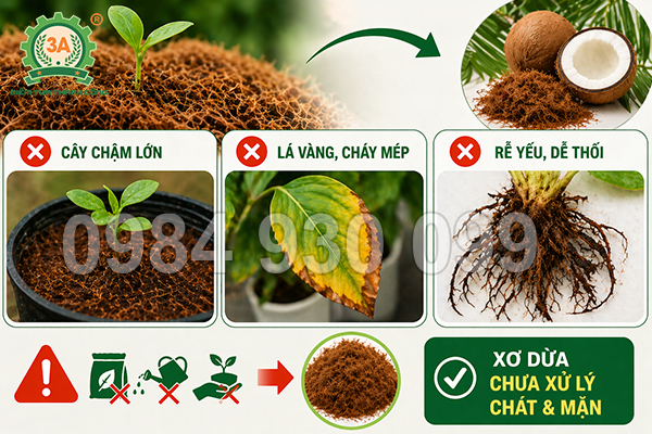 Nguyên nhân khiến cây trồng còi cọc rất có thể đến từ xơ dừa còn chát, còn mặn, chứa tanin và muối dư chưa được xử lý kỹ. Khi sử dụng loại xơ dừa này, bộ rễ sẽ bị ức chế, làm giảm khả năng hấp thu nước và dinh dưỡng.