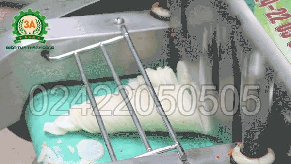 • Ưu điểm: Có băng tải tự động đưa nguyên liệu vào, đảm bảo an toàn, lát cắt đều, mịn, đẹp.